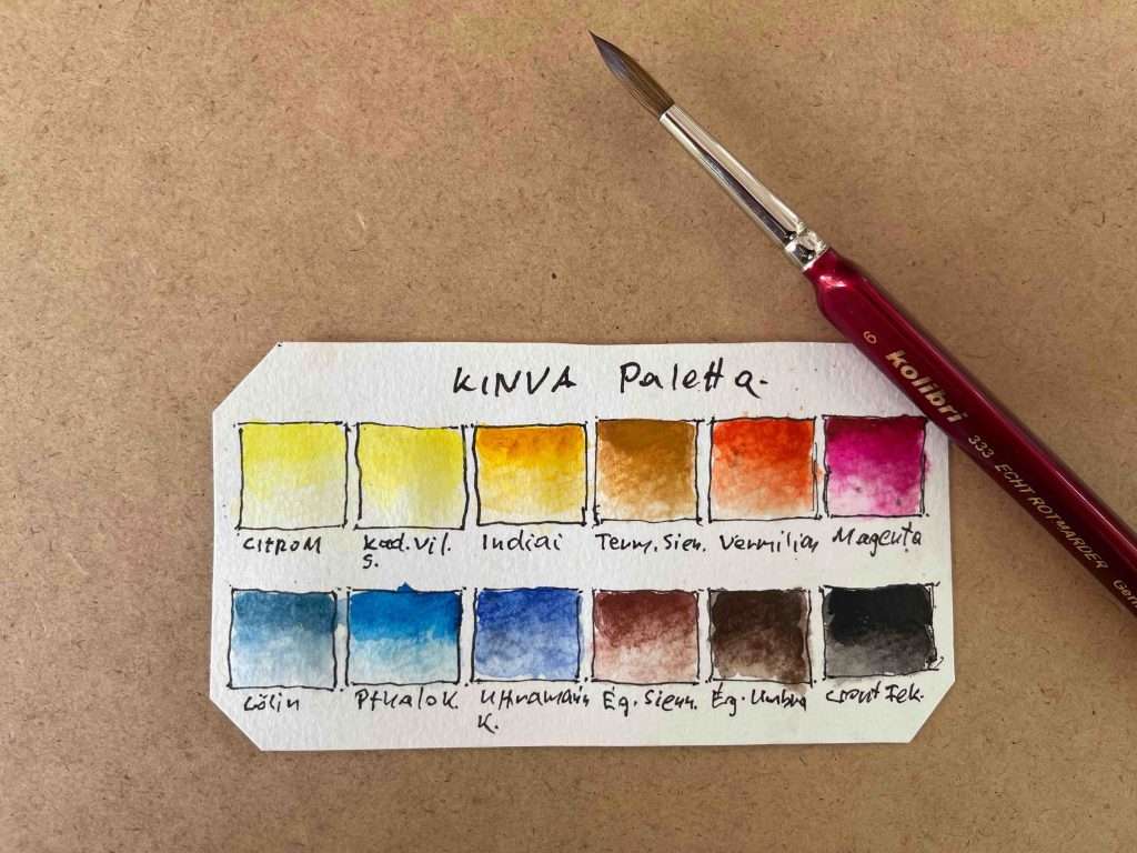 A paletta térképen minden szín neve, pontos elhelyezkedése a dobozban, továbbá a papíron való tényleges kinézete is látható. Ezt már csak azért is érdemes elkészíteni, mert ilyenkor egyrészt kipróbáljuk az új színeinket, másrészt pedig pontosan láthatjuk, hogy hogyan néz ki a valóságban is az adott szín, az akvarellpapíron.