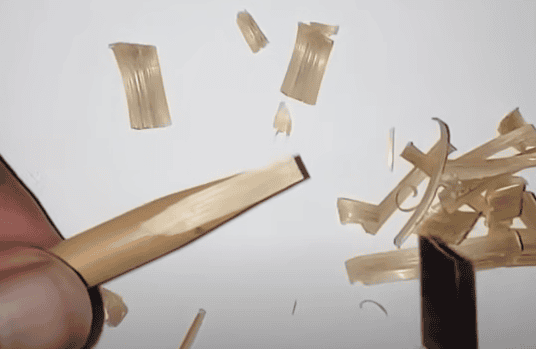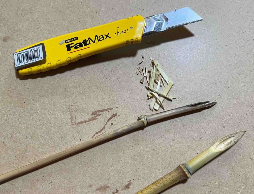 Itt azt csinálom, hogy kb. 5 cm-re a bambusz szál végétől elkezdek egy lépcsőt bele faragni, majd a fele távolságból, egy második, rövidebb lépcsőt is belefaragok, utána pedig a végét mindkét oldalról kb. 45-45 fokos szöget bezárva, hegyesre faragom és készen is van.